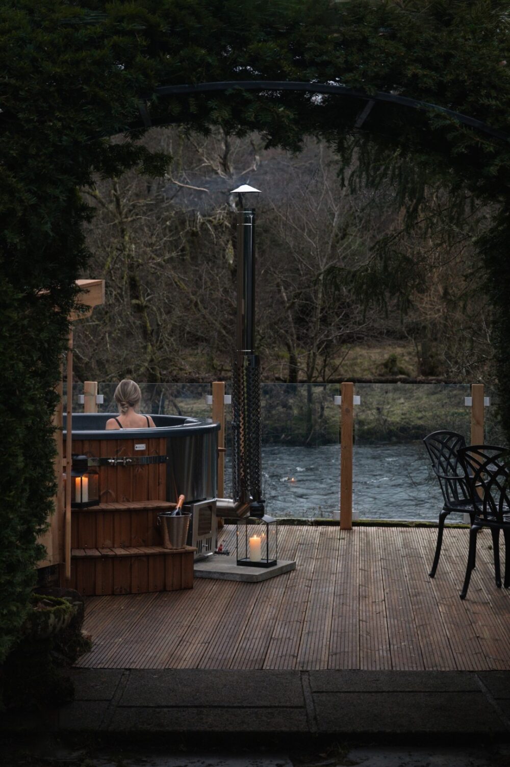Outside Bleaton Hallet House has a large open garden surrounding the farmhouse with a patio area complete with garden furniture which leads down to the decking area complete with private wood burning hot tub overlooking the black water.