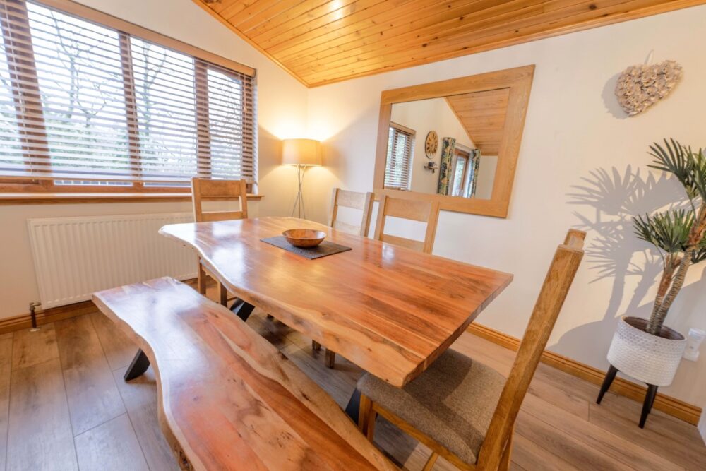 The sliding patio doors open onto your enclosed south facing decking area with private hot tub and patio furniture; with little light pollution at Conifer Lodges this offers a great space for spending your evenings star gazing.